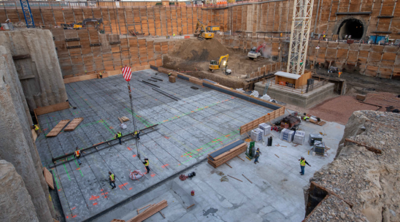 A construção da parte norte do Templo de Salt Lake continua. As equipes colocaram concreto em mais da metade da área. Isso fornece uma superfície de trabalho limpa e nivelada para a fundação dos novos pisos.